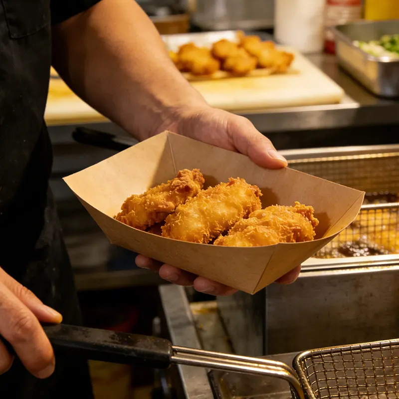 As a long-standing food packaging supplier with deep industry expertise, we always use professional and reliable food-grade raw materials. This Snack Kraft Boat Tray series is made of natural kraft paper, with a film covering the inner side. The kraft paper’s color is natural, making the product simple and premium. It not only won't compete with food for attention, but also can highlight the beauty of the food. The inner film enables it to hold the food with sauce, soup or oil. Therefore, most of the popular snacks can be packed with it.